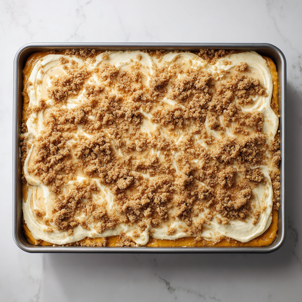 - Top with remaining pumpkin batter, spreading carefully to cover the cream cheese layer.